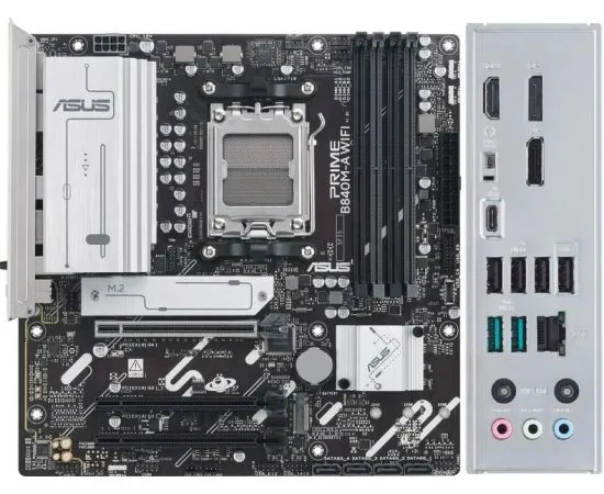 AM5/Micro ATX/AMD B840/170 Вт/Разъемы встроенного видео: 2 x DisplayPort, HDMI/4xDDR5 6400 (ОС)/SATA 3 - 4 шт., M.2 Socket 3 - 3 шт./RAID 0,1,5,10/без PS/2/USB 3.2 Gen 2 Type A - 2 шт., USB 2.0 - 4 шт., USB 3.2 Gen 2 Type C - 1 шт./без PCI слотов/PCIe x16 4.0 - 1шт, PCIe x1 3.0 - 2шт/Встроенное аудио 7.1/1 порт - 2.5 Gbps LAN/1 COM порт (на плате)/Bluetooth 5.3/802.11 a/b/g/n/ac/ax/6e/